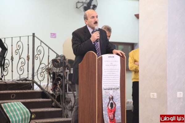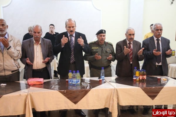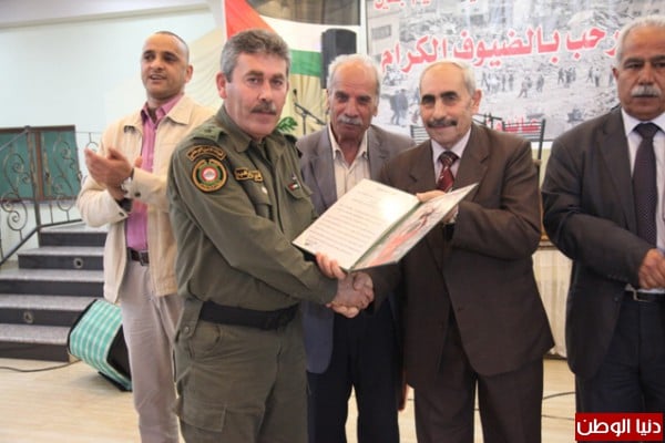 يرافقه مجموعة من الضباط وصف ضباط قوات الأمن الوطني الفلسطيني في احتفال الإسناد والموازنة لمركز الشباب الاجتماعي لمخيم جنين في قاعة الأمير.
