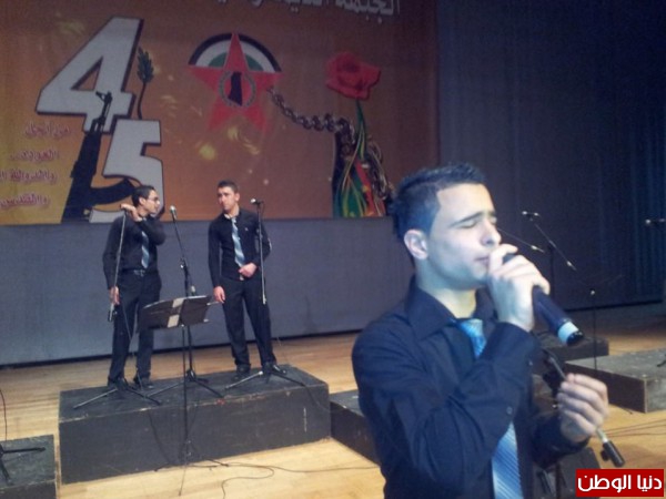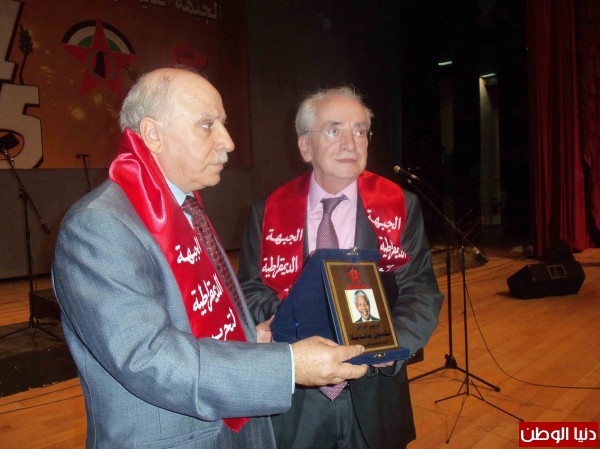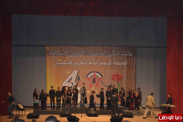 غصت قاعة الاونيسكو في بيروت بالحشود الجماهيرية في المهرجان الجماهيري المركزي الذي اقامته الجبهة الديمقراطية لتحرير فلسطين في الذكرى (45) لانطلاقتها. وتقدم الحضور: د. احمد جمعة ممثلا الرئيس بري، د. رمزي دسوم ممثلا العماد ميشال عون، د. سرحان سرحان ممثلا النائب وليد جنبلاط، العميد مصطفى حمدان امين الهيئة القيادية في المرابطون، سفيرة فنزويلا سعاد كرم، سفير كوبا رينيه سيبايو، القائم بأعمال سفارة جنوب افريقيا هوك دي فولك وممثل للسفارة الايرانية، المقدم محمد السبع ممثلا مدير عام الامن العام اللواء عباس ابراهيم، اضافة الى حشد من ممثلي الاحزاب اللبنانية والفصائل الفلسطينية وعدد من ممثلي المنظمات والهيئات والاتحادات واللجان الشعبية والمؤسسات والفعاليات اللبنانية والفلسطينية وابناء المخيمات الفلسطينية في لبنان..