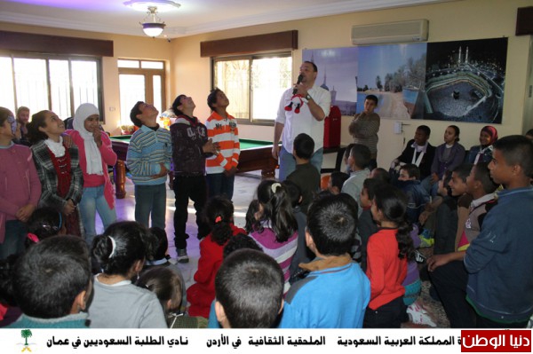 استطاع نادي الطلبة السعوديين بعمان بالملحقية الثقافية بسفارة خادم الحرمين الشريفين بالأردن أن يمسح الحزن عن شفاه "الأطفال اليتامى" في جمعية قرى الأطفال s.o.s الأردنية وأن يرسم ابتسامة على وجوههم البريئة ، من خلال استضافته لهم في يوم ترفيهي أقيم فيه حفل بهيج خصيصاً لأطفال الجمعية في مقر النادي بمنطقة الجندويل بعمّان .