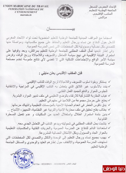 بيان الجامعة الوطنية للتعليم مراكش