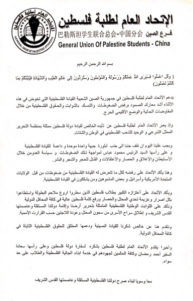 الأتحاد العام لطلبة فلسطين في جمهورية الصين الشعبية يؤكد دعمه للقيادة الفلسطينية