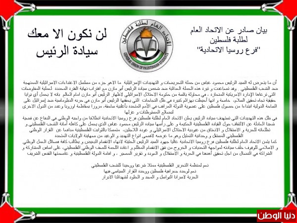 أصدر الاتحاد العام لطلبة فلسطين"فرع روسيا الاتحادية"وتحت شعار "لن نكون الا معك سيادة الرئيس" بيانا داعما لرئيس السلطة الفلسطينية محمود عباس وجاء البيان على النحو التالي: أن ﻣﺎ ﯾﺗﻌرض ﻟﮫ السيد اﻟرﺋﯾس ﻣﺣﻣود ﻋﺑﺎس ﻣن ﺣﻣﻠﺔ التحريضات و التهديدات اﻹﺳراﺋﯾلية ما الاھو ﺟزء ﻣن ﻣﺳﻠﺳل اﻻﻋﺗداءات الاﺳراﺋﯾلية اﻟﻣﻣﻧﮭﺟﺔ ﺿد اﻟﺷﻌب اﻟﻔﻠﺳطﯾﻧﻲ .