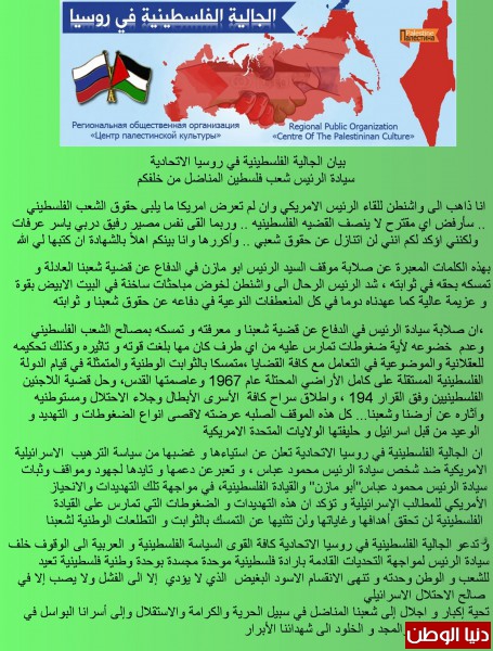 أصدرت الجالية الفلسطينية في روسيا بيانا داعما للرئيس محمود عباس جاء فحواه على النحو التالي"...انا ذاهب الى واشنطن للقاء الرئيس الامريكي وان لم تعرض امريكاما يلبى حقوق الشعب الفلسطيني سأرفض اي مقترح لا ينصف القضيه الفلسطينيه .. وربما القى نفس مصير رفيق دربي ياسر عرفات .. ولكنني اؤكد لكم انني لن اتنازل عن حقوق شعبي ..وأكررها وانا بينكم اهلاً بالشهادة ان كتبها لي الله "...