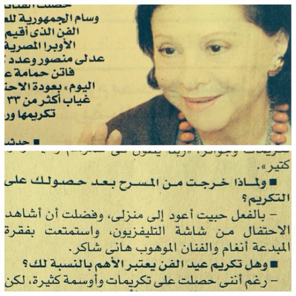 وصرحت فاتن حمامة في حديث صحفي بأنها استمتعت بفقرة أنغام الغنائية خلال مشاركتها في عيد الفن الخميس 13 مارس الجاري، ووصفتها بـ "المبدعة" لإعجابها الشديد بصوتها.