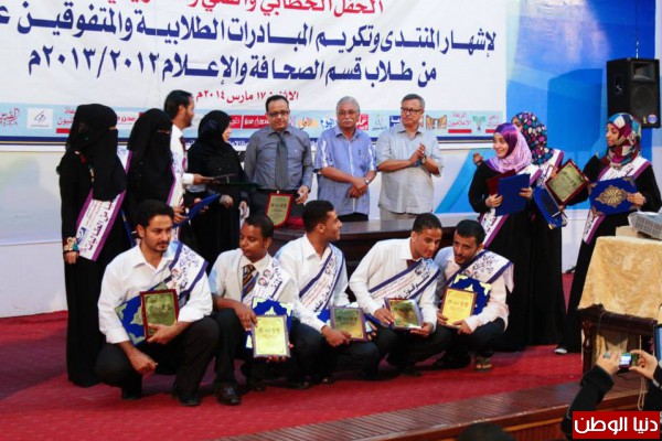 اعقب ذلك فقرات تكريم المتفوقين علميا من طلاب قسم الصحافة والاعلام وكذا اصحاب المبادرات الطلابية ونجوم مسلسل ( فرصة اخيرة ) الذي عرض على شاشات قناة السعيدة كما جرى تكريم ادارة المنتدى واللجان العاملة على انجاح الحفل وعدد من