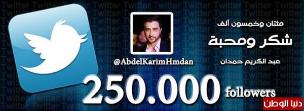 احتفل الفنان السوري عبد الكريم حمدان بوصول عدد معجبيه عبر تويتر إلى أكثر من 250 ألف متابع .