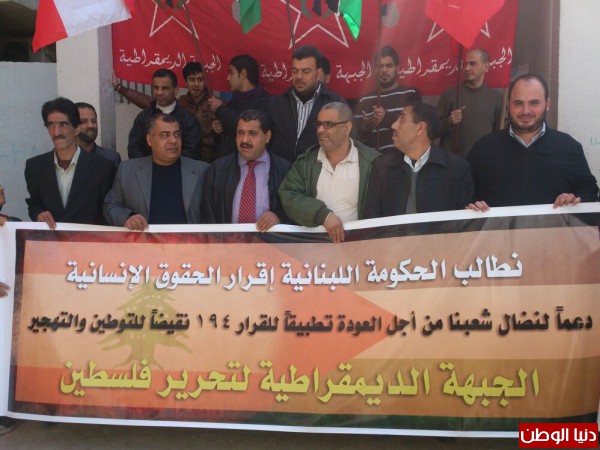نفذت الجبهة الديمقراطية لتحرير فلسطين اعتصاما جماهيريا حاشدا احتجاجا على عدم ادراج ملف الحقوق الانسانية لشعبنا في لبنان بالبيان الوزاري للحكومة اللبنانية ، وتزامنا مع انعقاد جلسة النواب اللبناني وذلك امام مكتب مدير الاونروا في مخيم البداوي، بمشاركة ممثلي الفصائل واللجان الشعبية وحشد من الفعاليات الاجتماعية وجمهور من أبناء مخيمي البداوي ونهر البارد . وقد رفع المعتصمون الشعارات السياسية التي تطالب الحكومة بإقرار الحقوق الانسانية للاجئين في لبنان وأعلام فلسطين ولبنان ورايات الجبهة الديمقراطية .