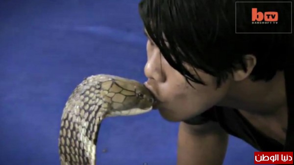 وظلت الكوبرا، التي تعتبر إحدى أخطر أفاعي العالم، ثابتة لا تحرك ساكناً معلنة استسلامها للقبلة، ثم انسحبت بهدوء وهي تنظر باتجاه الشاب وكأنها عاجزة عن فهم ما تعرضت له.