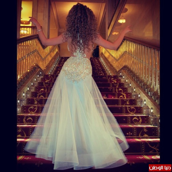 وتألقت بفستان أبيض عاري الظهر ومكشوف الصدر من تصميم المصمم اللبناني رامي القاضي .