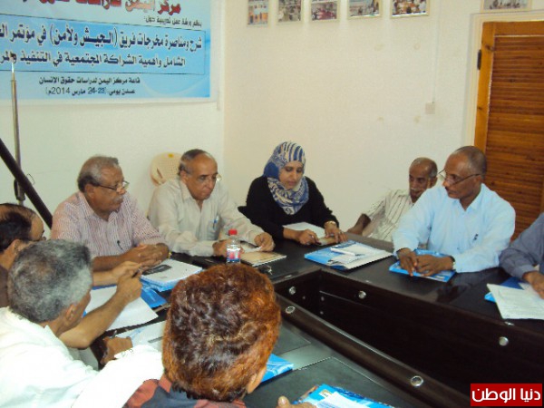 نظم صباح اليوم الأحد الموافق 23- مارس- 2014م في قاعة اجتماعات مركز اليمن لدراسات حقوق الإنسان ورشة العمل الـ(7) لبرنامج التوعية والمناصرة لمخرجات مؤتمر الحوار الوطني الشامل، الذي ينفذه المركز .. حيث خـُصصت هذه الورشة للوقوف أمام مخرجات فريق الجيش والأمن" ويشارك فيها 30 مشاركـًا ومشاركة، التي تستمر يومين.