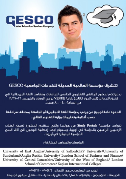 أعلنت مؤسسة العالميه الحديثه الجامعيه ( GESCO) عن اقامة الملتقى التعليمي الخامس للجامعات والمعاهد البريطانيه لجميع من يرغب بدراسة اللغه الانجليزيه او الجامعه بمختلف مراحلها في فندق Land Mark بقاعة Venue يومي الاربعاء والخميس 26-27/3/2014 من الساعه 4 ولغاية 8 مساءا وذلك لمقابلة مندوبين لأكثر من 15 جامعه ومعهد بريطاني متواجدين في المعرض .