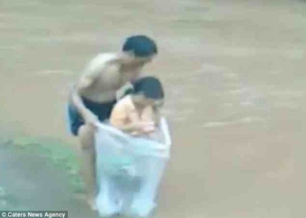 رجل فيتنامي ينقل تلاميذ المدرسة من مياه الفيضان في كيس بلاستيك