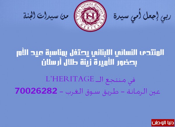 برعاية وحضور الأميرة زينة طلال ارسلان وبمناسبة عيد الأم إحتفل المنتدى النسائي اللبناني – شارون، بصبحية جمعت عدد كبير من الأمهات في منتجع L'Heritage عاليه – عين الرمانة - طريق سوق الغرب ، قدّم الحفل السيدة إقبال صعب التي رحّبت بالحضور وهنأتهم بمناسبة عيد الأم ، من ثم كانت الكلمة للأميرة زينة طلال أرسلان التي بدأت كلمتها موجهة تحيّة إكبار الى كل أم لبنانية ناضلت وضحّت من أجل أسرتها والوطن، كما وجهت تحيّة لكل الأمهات في العالم، وشكرت إدارة وأعضاء المنتدى النسائي اللبناني على مجهودهم وتنظيمهم هذه الصبحية الجميلة التي جمعت السيدات من مختلف المهن والمناطق اللبنانية ، فيما بعد إستلمت درعاً تكريمياً من رئيسة المنتدى السيدة إقبال صعب.