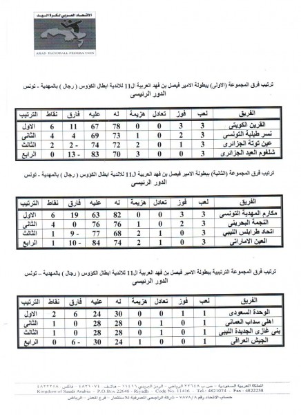 جدول النصف النهائى للبطولة العربية لكرة اليد بالمهدية للرجال والسيدات والترتيب والنتائج الرسمية