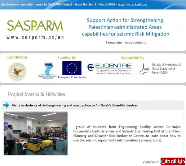 اصدر مشروع تخفيف مخاطر الزلازل في فلسطين SASPARM الذي تنفذه جامعة النجاح الوطنية بالتعاون مع المركز الأوروبي لهندسة الزلازل “EUCENTRE” وجامعة “ IUSS” في بافيا – ايطاليا ضمن مشاريع “ FP7” الاوروبية نشرته الإلكترونية الثانية باللغتين العربية والإنجليزية.