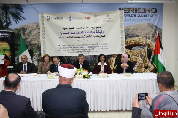 وقعت شخصيات سيادية رسمية ومنظمات ومؤسسات اهلية وشعبية واطر نسوية " وثيقة مناهضة العنف ضد النساء" وذلك في احتفال جرى ظهر اليوم في مقر محافظة اريحا والاغوار وسط المدينة, بحضور ماجد الفتياني محافظ اريحا والاغوار وربيحة ذياب وزيرة شؤون المراة, ومحافظ رام الله والبيرة ليلى غنام ,والقنصل الايطالي دافيده لا شيشيليا, وممثلي ونواب المحافظات الشمالية.