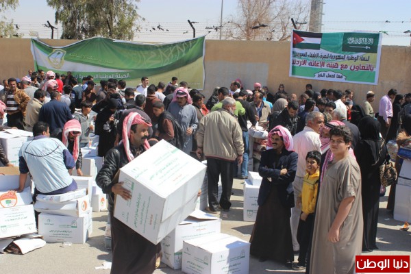 وسط أجواء انسانية امتزجت فيها مشاعر الفرح والأمل .. وزعت الحملة الوطنية السعودية لنصرة الأشقاء في سوريا بالتعاون مع هيئة الإغاثة الأردنية يوم أمس الأربعاء في محطتها الـ 13 مساعدات عينية على "1030" أسرة سورية بالأردن يتراوح عدد أفراد الأسرة الواحدة ما بين (4-14) فرد ، وقد استكمل التوزيع منطقة البادية الشرقية الأردنية حيث شمل أهالي قرية (عمرة وعميرة ، أم الجمال، روضة الأميرة بسمة ،أم السرب ، سما السرحان ، الحمرا ، المغيّر) والتي غالبية قاطنيها من اللاجئين السوريين هم من سكان الخيم والبيوت الغير صالحة للسكن، حيث تم التوزيع في الملعب البلدي بمدينة المفرق ، فيما باشرت الحملة توزيع المعونات منذ ساعات الصباح الباكر واستمرت الى ما بعد الساعة الخامسة مساءً .