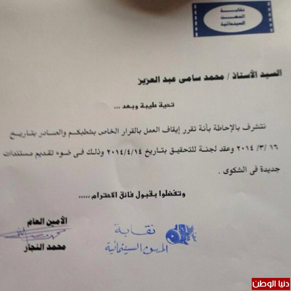 بعد أن قرر أعضاء مجلس إدارة نقابة المهن السينمائية المصرية شطب المخرج محمد سامي من عضوية النقابة في مصر بسبب التزوير , تم أيقاف القرار .