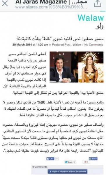 اشتعل فتيل الحرب بين شمس الأغنية نجوى كرم والملحن اللبناني سمير صفير بعد أن انتقدها في لقاءه مع الإعلامي قاسم دغمان وانتقد طريقة غنائها في مهرجان "هلا فبراير" وانتقائها لكلمات أغانيها .