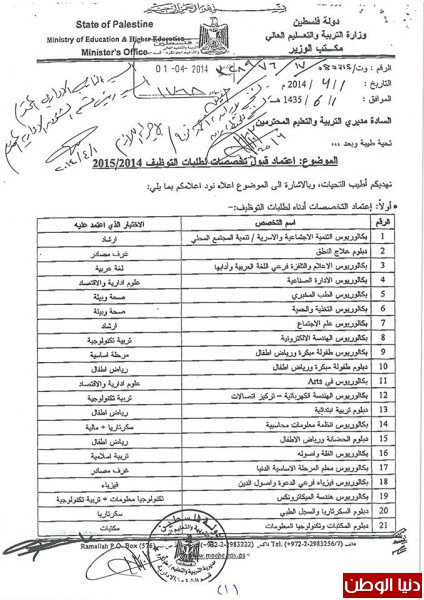 تربية طولكرم تعلن عن أعتماد التخصصات للتوظيف للمعلمين والسكرتاريا والإرشاد
