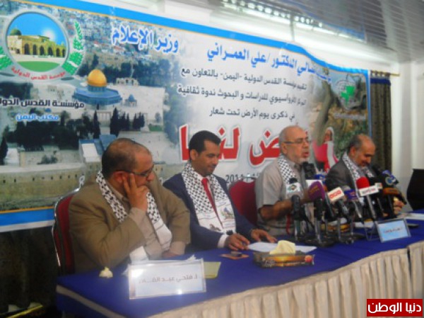تحت شعار " الأرض لنا" اقامت مؤسسة القدس الدولية مكتب اليمن وبالتعاون مع مركز الأفرو أسيوي للدراسات والبحوث ندوة ثقافية عن القضية الفلسطينية تزامناً مع الذكرى ال38 ليوم الأرض وبرعاية رسمية من معالى وزير الإعلام اليمني على