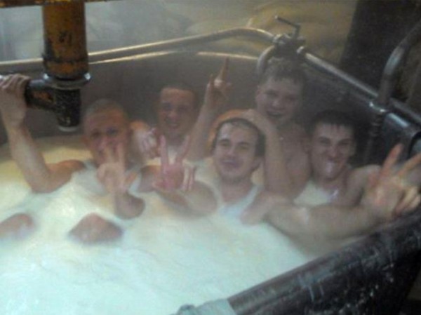 بالصور.. عمال روس عراة في حوض للحليب بمصنع جبنة