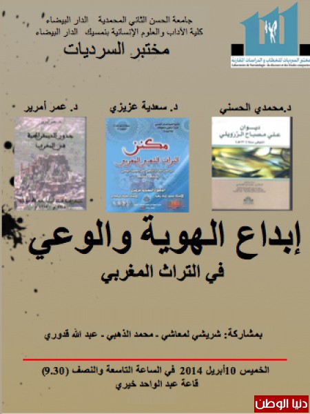 ينظم مختبر السرديات بكلية الآداب والعلوم الإنسانية بنمسيك الدار البيضاء، ندوة في موضوع: "إبداع الهوية والوعي في الثراث المغربي"، وذلك يوم الخميس10 أبريل2014، بقاعة عبد الواحد خيري، على الساعة 09:30 صباحا.