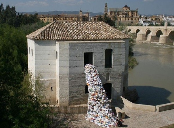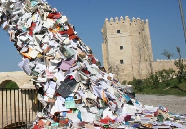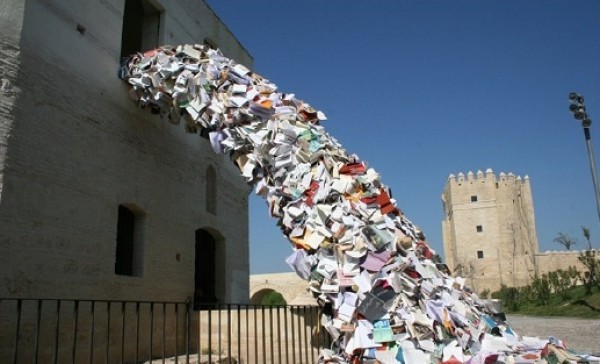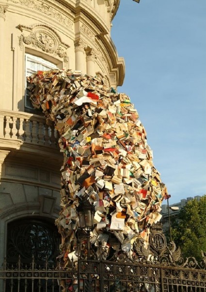 فنانة اسبانية تصمم لوحة مجسمة من الكتب وكأنها تفر هاربة من النوافذ قامت احدى الفنانات التشكيليات بأسبانيا بتصميم لوحة مجسمة من الكتب بكم ضخم ورهيب وكأنها تفر هاربة من مكانها عبر النوافذ كما السيل أو الإعصار.