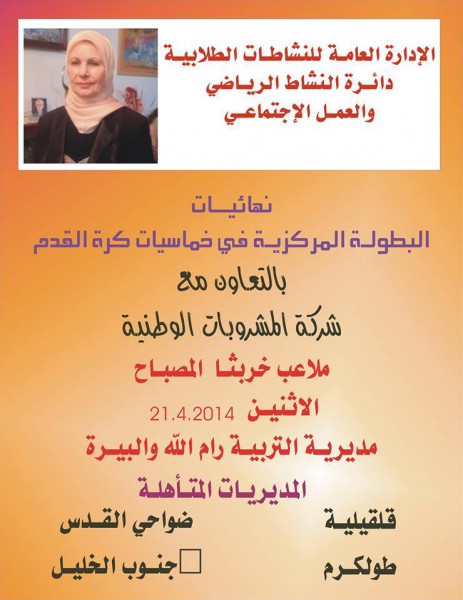 ضمن الخطة الإستكمالية للإدارة العامة للنشاطات الطلابية - دائرة النشاط الرياضي - تقرر يوم غد الأثنين الساعه التاسعه صباحا نهائي خماسيات كرة القدم المركزية للمرحلة الاساسية العليا بنين بالتعاون مع شركة المشروبات الوطنية كوكا كولا على ملاعب مدرسة خربثا المصباح في مديرية التربية والتعليم رام الله والبيرة بمشاركة المديريات المتأهلة عن المجموعات قلقيلية، تمثل مجموعة مديريات نابلس،جنوب نابلس،سلفيت طولكرم، تمثل مجموعة مديريات جنين،قباطية،طوباس ضواحي القدس، تمثل مجموعة مديريات رام الله والبيرة،القدس،أريحا جنوب الخليل، تمثل مجموعة مديريات الخليل،شمال الخليل،بيت لحم يقوم بتحكيم المباريات حكام من مديريات التربية والتعليم.