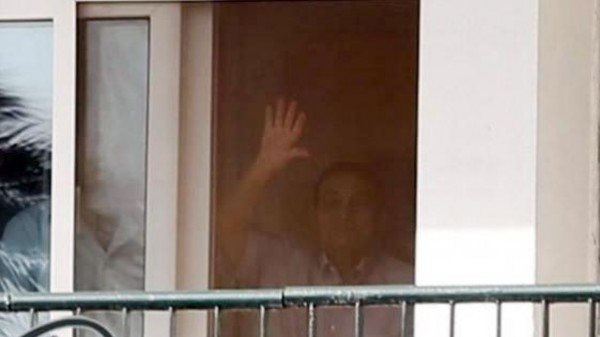 وبدا مبارك يلوح بيديه من خلف الزجاج الخاص بشرفة غرفته بالمستشفى. وكانت اللقطات بعيدة ولكنها واضحة.