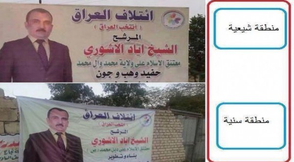ووزع المرشح إياد الأشوري ثلاث نسخ مختلفة من “بوسترات” الدعاية الخاصة به، إذ كتب على احداها المعلقة في الأحياء ذات الغالبية الشيعية “المرشح إياد الأشوري معتنق الاسلام على ولاية محمد وآل محمد، وحفيد وهب وجون” في محاولة واضحة لدغدغة مشاعر العقل الشيعي الجمعي وذلك من خلال ربط نفسه بـ”وهب وجون ” التي تقول الروايات الشيعية انهما مسيحيان خرجا لنصرة الأمام الحسين وأستشهدا معه في معركة الطف في كربلاء سنة 61 هجرية (680 م ) .