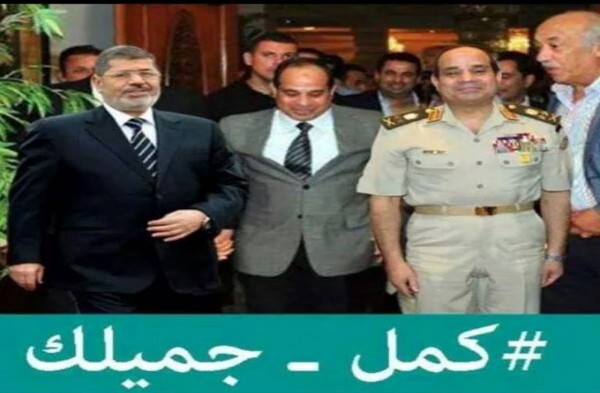 وكانت أقوى هذه الصور المعالجة، المشهد الذي جاء بالسيسي، المرشح الرئاسي الذي يصالح وزير الدفاع السابق، المشير السيسي على الرئيس المعزول محمد مرسي.