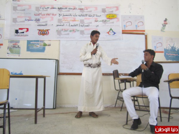 حيث قدمت فرقة انغام سبأ الفنية عرضا مسرحيا حول الفيدرالية والانتخابات والدستور وسلطت الضوء فيه على دعم مخرجات الحوار الوطني واهمية تفاعل المجتمع مع هذه المرحلة والمشاركة في انجاح المرحلة الانتقالية.