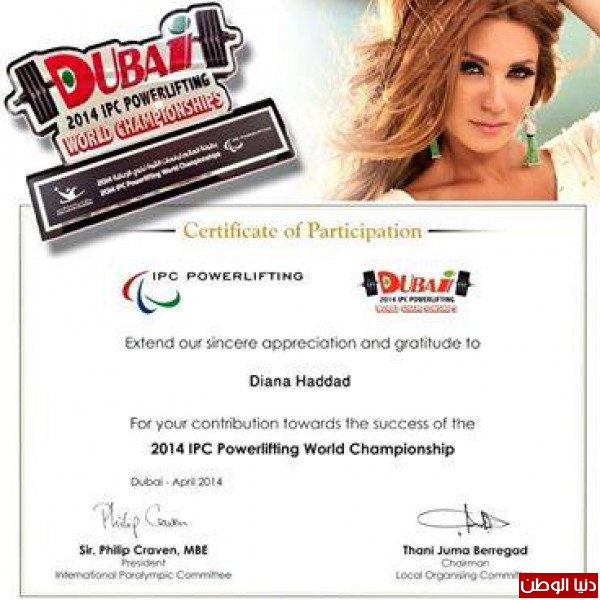 شكرت الفنانة اللبنانية ديانا حداد من خلال صفحتها الشخصية على الفيس بوك المنظمين لبطولة كأس ونادي دبي للمعاقين .