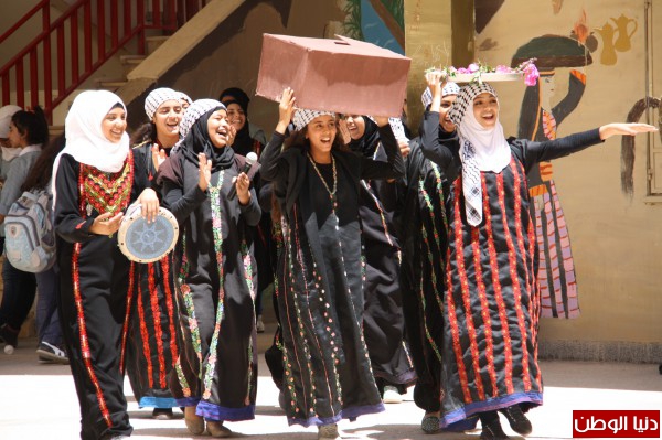 وتزينت اجساد المعلمات والطالبات بالأثواب الفلسطينية المطرزة والتي من خلال الوانها الزاهية ورسماتها المختلفة تميز بين ثوب الفتاة االخليلية عن الفتاة الغزاوية او ثوب العروس القادمة من الجليل وقرى المثلث او "المدرجة " مع لفظ الجيم باللهجة المصرية والتي عادة ترتديها سمراء اريحا والاغوار وتضيف رانه عبد العال مديرة المدرسة فرغم كل محاولات الاحتلال الاسرائيلي للتزييف الحقائق وسرقة التراث الكنعاني الفلسطيني,