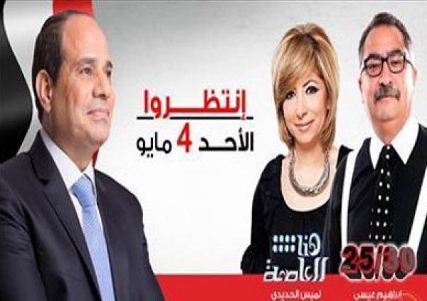 أكدت مصادر إعلامية لمواقع مصرية أن حوار المرشح للرئاسة عبدالفتاح السيسي المتوقع إذاعته الأحد المقبل 4 مايو سوف يتم بثه على 6 قنوات منها 5 قنوات فضائية بالإضافة للتليفزيون المصري، والقنوات هي : أون تي في و سي بي سي والحياة والنهار ودريم