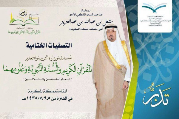 برعاية صاحب السمو الملكي الأمير مشعل بن عبدالله بن عبدالعزيز آل سعود أمير منطقة مكة المكرمة , يفتتح وكيل إمارة المنطقة الدكتور عقاب بن صقر اللويحقومدير تعليم مكة الأستاذ حامد بن جابر السلمي التصفيات النهائية القرآن الكريم والسنة النبوية وعلومهما "تدبر" للطلاب والمعلمين على مستوى