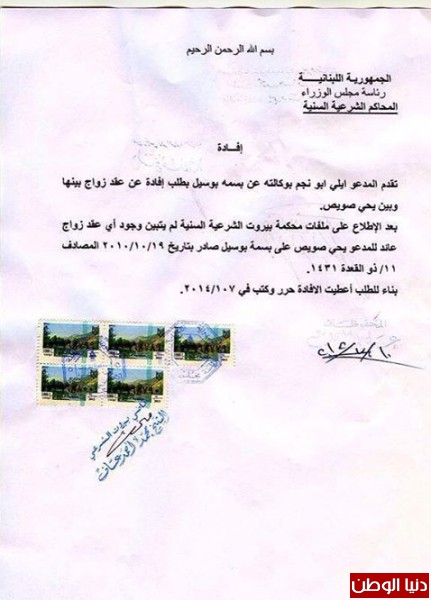وكان تامر قد نشر وثيقة من المحكمة الشرعية في بيروت تبرئ زوجته من شائعة زواجها بزميلها الفنان الأردني يحيى صويص .