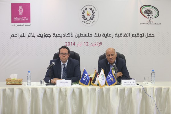 وقع بنك فلسطين ممثلا بالسيد هاشم الشوا، رئيس مجلس الإدارة والمدير العام لبنك فلسطين، واللواء جبريل الرجوب رئيس الاتحاد الفلسطيني لكرة القدم، مذكرة تفاهم لدعم أكاديمية جوزيف بلاتر للبراعم. وجرى توقيع المذكرة خلال حفل اقيم يوم الاثنين 2014/05/12 في مقر أكاديمية جوزيف بلاتر بمدينة البيره، بحضور عدد من المسؤولين ورؤساء الاتحادات الرياضية، ومدراء المناطق والدوائر في بنك فلسطين، اضافة لحشد من ممثلي القطاع الخاص ومؤسسات المجتمع المدني، وعدد من الاعلاميين والصحفيين وموظفين في البنك.
