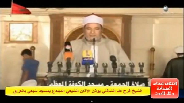 وكان الشيخ فرج الله الشاذلي قد أدى الأذان الشيعي بمسجد الكوفة بالعراق خلال صلاة الجمعة الماضية.