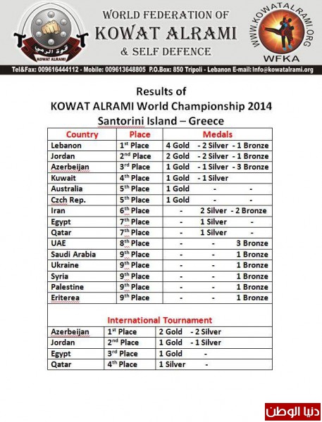 أوكرانيا – سوريا – فلسطين- ارتيريا في المركز التاسع وكان للمشاركة العربية الدور البارز في هذه البطولة، وكذلك التعاون بين الاتحاد اللبناني للكيك بوكسينغ من خلال الاستاذ عبدالرحمن الريس والاستاذ محمد زهرة والاستاذ علي اشلان والاتحاد اللبناني لرياضات قوة الرمي والدفاع عن النفس بشخص رئيسه د. وليد قصاص واثبتوا فعليا وجودهم كفريق واحد باتحادان.