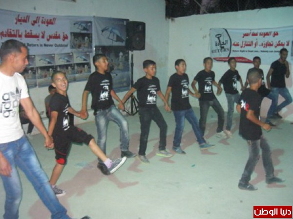 وفرقة فرح ومرح بالرسم على الوجوه الإعلام الفلسطينية وكلمات تؤكد على حق العودة كما تم تنفيذ عدة العاب حركية وتثقيفية ترفيهية للمشاركين ، كما قدمت فرقة أشبال الحرية عرضا للدبكة الشعبية التي تعتبر جزء أصيلا من تراثنا .