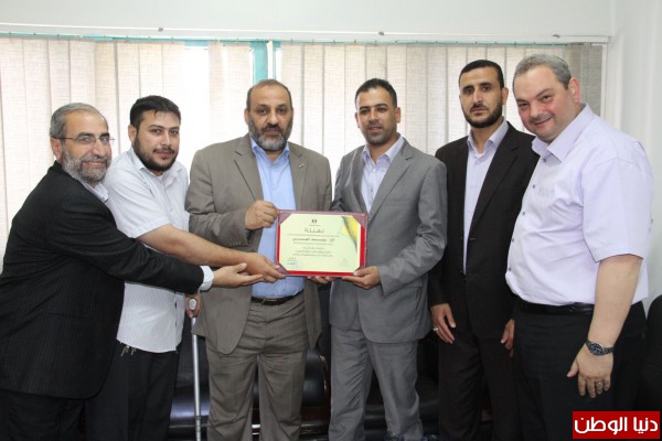 وسلم المدهون شهادة تهنئة ودرع وسام الأقصى لمحمد العربي تعبيراً عن تقديره واعتزازه بالجائزة التي حصل عليها .