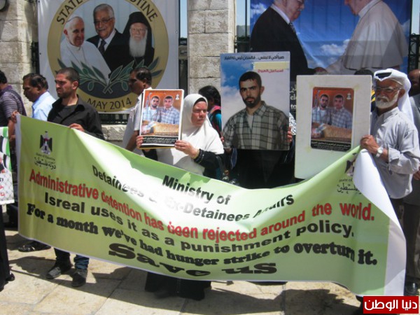 أقام نادي الأسير الفلسطيني ووزارة شؤون الأسرى في بيت لحم اعتصاماً تضامنياً مع الأسرى الإداريين المضربين أمام ساحة المهد وقد شارك في هذا الاعتصام العديد من أهالي الأسرى والفعاليات الوطنية.