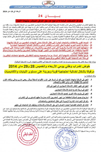 الأساتذة المجازون: إضراب وطني 28 و29 ماي 2014 واحتجاجات بالنيابات والأكاديميات