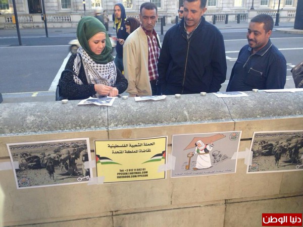 قامت الحملة الشعبية لمقاضاة المملكة المتحدة بتنظيم وقفة احتجاجية امام مكتب رئيس وزراء بريطانيا في لندن أمس الأحد 25/5/2011 أضيئت فيها الشموع ووضعت فيها الأزهار كتعبير عن الحزن على ضحايا النكبة وتم تسليم رسالة باسم الحملة الشعبية لمقاضاة بريطانيا قضائيا لرئيس الوزراء البريطاني لمطالبة بريطانيا بالاعتراف قانونيا بمسؤوليتها عن ما حدث للشعب الفلسطيني