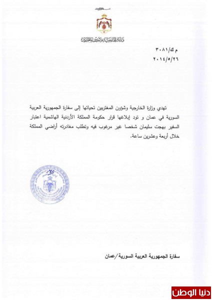 ابلغت وزارة الخارجية وشؤون المغتربين الاردنية السفارة السورية في عمان بأن السفير السوري بهجت سليمان شخص غير مرغوب به وعليه مغادرة اراضي المملكة الاردنية الهاشمية خلال 24 ساعة.