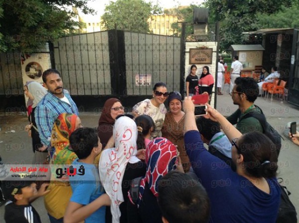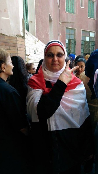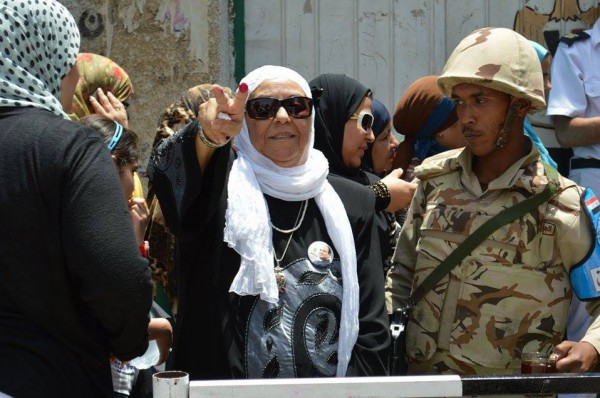 صور السيسي تغطي الجدران وقالت له سيدة مسنة ذات شعر أبيض كانت تدلي بصوتها "كنا نعتزم ترك البلد ولكنك أنقذتنا من الدمار الشامل"، فرد عليها السيسي "ستظلون في البلد وستعيشون في أمان".