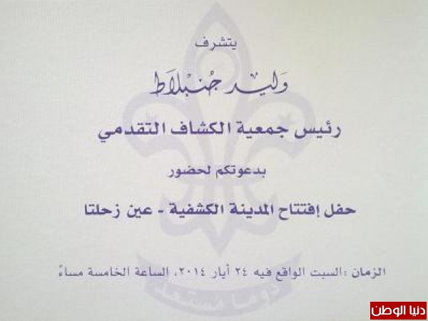 و قد لبت جمعية الكشافة و المرشدات الفلسطينية الدعوة جمعية الكشاف التقدمي لحضور حفل افتتاح المدينة الكشفية في عين زحلتا ، حيث حضر امين سر المفوضية العامة في لبنان القائد خالد عوض و رئيس لجنة مفوضية صيدا القائد رضوان عبد الله ، ومعهما القادة و القائدات على التوالي: وائل عبد الله ، محمد عوض ، حسن عباسي ، رشا عبد الله ، اسراء الجمعة ، فاطمة ياسين ، هيفاء الاطرش ، اضافة الى وفد من نادي العودة ممثلا بالسادة عصام كروم و علي جمعة و ام فخري كروم .