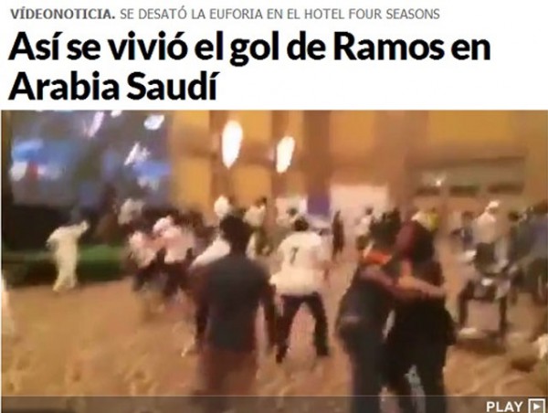 وعلقت الصحيفة على الفيديو وقالت: هكذا احتفلت الجماهير في فندق "فور سيزونز" في المملكة العربية السعودية، الجماهير السعودية أطلقت العنان لفرحتها بهدف التعادل الذي سجله راموس"، حسب صحيفة سبق.